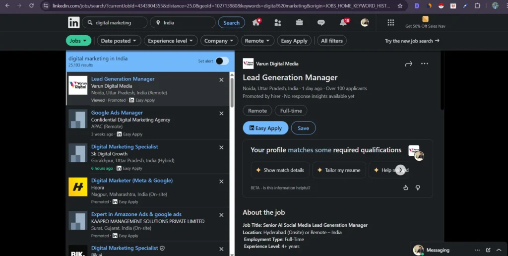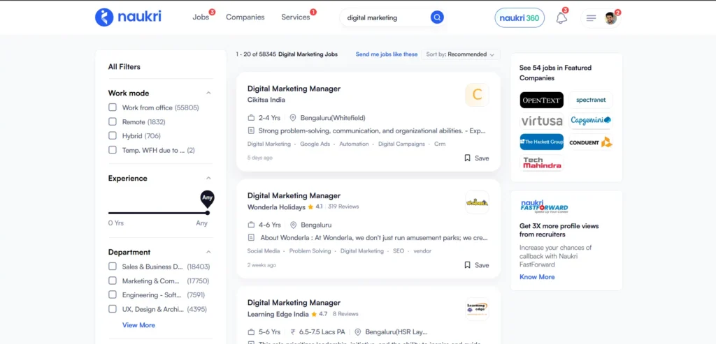 Naukri is more traditional, but still valuable to find Remote jobs in india. Around 30M job applicants visit Naukri portal to find their dream job. Many companies list remote and hybrid openings, though labels aren’t always clean. In Naukri also, You will get many filters like Work mode, Department etc so you need to choose “Remote” to get accurate remote jobs. You can also try searching keywords like “remote”, “WFH”, and “anywhere” gives better results.