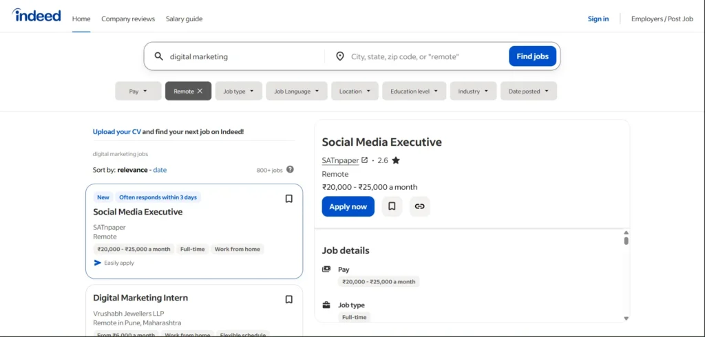Indeed is also a reputed job portal in India and is good for verified roles. Quality varies, but legitimate companies still rely on it for customer support, content, operations, and mid‑level roles.
